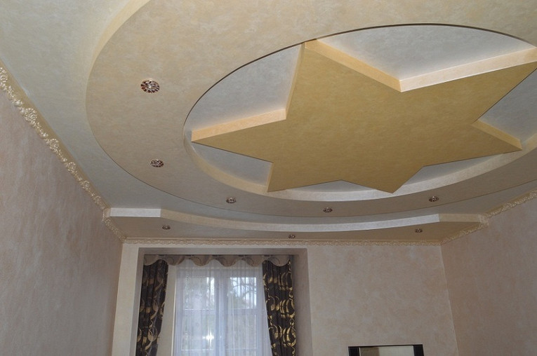 По своей сути фигурный потолок, изготовленный из гипсокартона, относится к натяжным системам. Создать уникальную фигуру в своей комнате можно, выбрав конструкцию, состоящую из нескольких отдельных уровней. В основе потолочной конструкции лежит гипсокартон. Именно наличие в основе этого материала и является главным преимуществом.